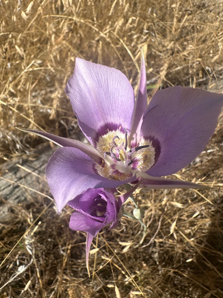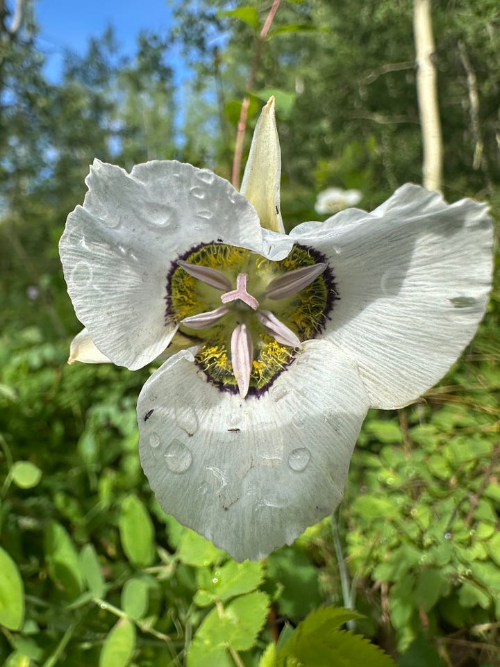A lawn or yawn of fawns, a mundane murder of magpies, an army of wooly bear caterpillars, colony of rebounding beavers (what she said?), a swarm of bees in the cherry trees, a mariposa of moose, a stripe of sego lookalike lilies in the fallow yellow grasses by the trail--a trail of trying, failing, a whole field of grasses, a riverfull of warblers, wisping-- belting!-- flashing their golden wings.