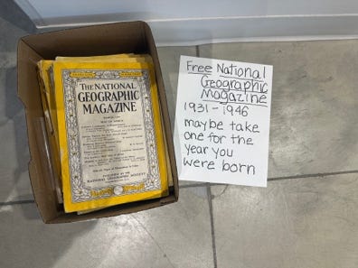 And at the Winthrop Public Library, where I read with Mery Smith, Laura Read, Cynthia Williams-Guitierrez, Subhaga Crystal Bacon ++, and met several charming humans, I also found this reminder of a relic: boxes of free National Geographic!